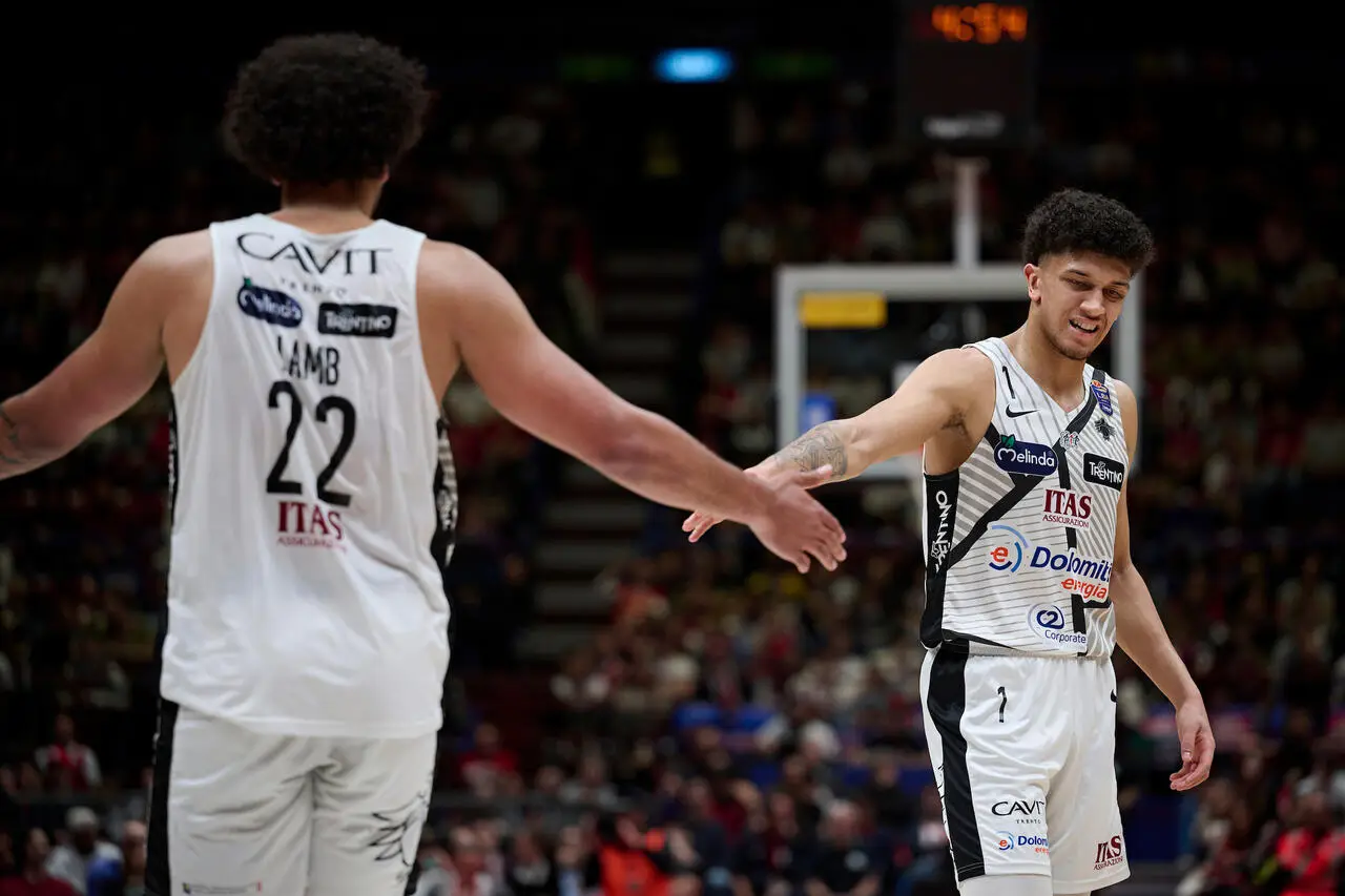 Cale apre le marcature con una tripla dall’angolo, ma rispondono subito LeDay, Shields e Brooks. Cale e Niang rimettono punti a referto per i bianconeri, poi LeDay segna altri due punti e Lamb completa il parziale per l’11-9. Mannion entra in area e appoggia due punti facili, ma Ford risponde dalla lunetta riportando Trento a -2. Shields e LeDay firmano il 16-11 e coach Galbiati è costretto a chiamare timeout. Al rientro, Ford replica a Causeur, Flaccadori segna da tre, Lamb fa 2/2 ai liberi e Ford piazza una gran tripla. Ricci, però, segna sulla sirena il 24-19 con cui si chiude il primo quarto.