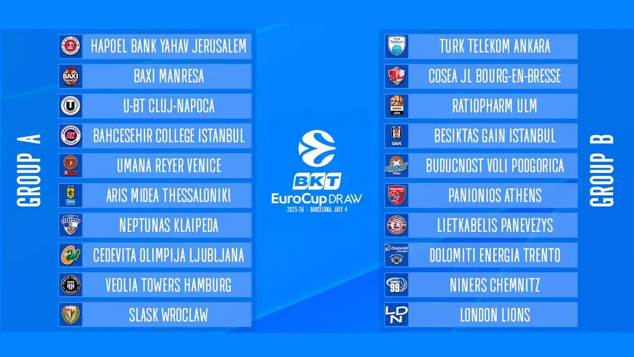 BARCELLONA – Si è svolto oggi a Barcellona il sorteggio della BKT EuroCup 2025-26, che ha definito la composizione dei due gironi da dieci squadre ciascuno. La Dolomiti Energia Trentino è stata inserita nel Gruppo B, dove affronterà: Turk Telekom Ankara, Cosea JL Bourg-en-Bresse, Ratiopharm Ulm, Besiktas Gain Istanbul, Buducnost Voli Podgorica, Panionios Athens, Lietkabelis Panevezys, Niners Chemnitz e London Lions.