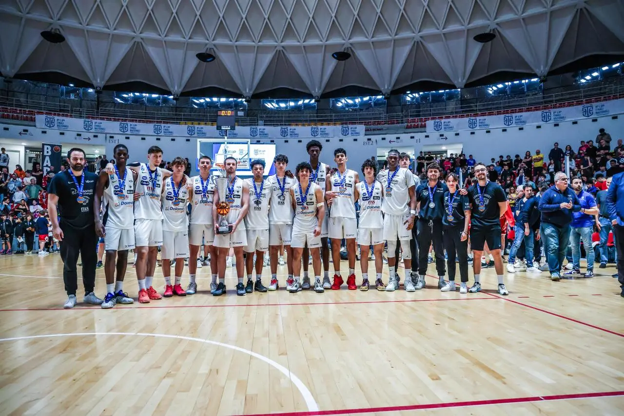 ROMA – Un percorso straordinario per i giovani bianconeri, che conquistano una meritatissima medaglia d’argento alle Finali Nazionali Under 19. La squadra di coach Molin, partita dal terzo posto nel girone, ha saputo crescere partita dopo partita: ha superato lo spareggio contro la Scaligera Verona, approdando ai quarti di finale, dove ha messo in campo due prestazioni di altissimo livello. Prima la vittoria contro Fulgor Fidenza per 66-61, trascinata da uno strepitoso Cheickh Niang, poi il successo in semifinale contro la Stella EBK Academy per 56-51, con un Denis Badalau decisivo. Nella finalissima scudetto, Trento parte forte e va subito in vantaggio, ma nel finale del secondo quarto l’Olimpia Milano ribalta l’inerzia e chiude avanti di tre. Il break decisivo arriva sul finire del terzo periodo, quando Milano allunga in maniera definitiva: il punteggio finale è 82-61, ma non cancella l’impresa dei bianconeri. Un traguardo importante, frutto di talento, sacrificio e spirito di squadra e Denis Badalau è stato inserito nel primo quintetto delle Finali Nazionali Under 19 ed è il miglior realizzatore della competizione.