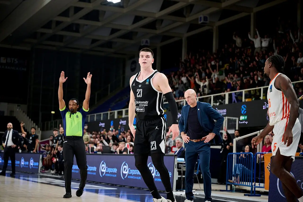 Dolomiti Energia Trento: Jones 23, Niang 3, Forray 5, Airhienbuwa, Cattapan N.E, Mawugbe 1, Aldridge 13, Jakimovski 30, Bayehe 2, Medina Bouza N.E, Hassan 2, Battle 15. Coach Cancellieri.