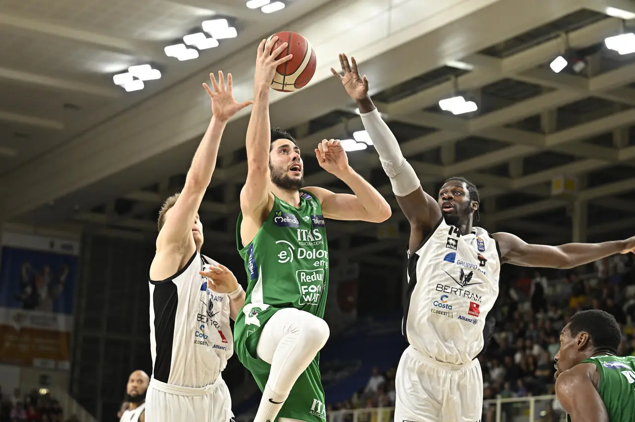 La cronaca del match. Biligha apre le danze con una stoppata e una schiacciata, poi è Alviti a tenere Trento produttiva in attacco nonostante l’impatto fisico di Kamagate sotto i tabelloni (10-9). Tortona allunga grazie a una fiammata di Ross (12-16 dopo un tecnico a Galbiati), l’uscita per infortunio del centrone francese “accende” Weems e gli ospiti sono avanti 16-24 dopo 10’ di gioco. La Dolomiti Energia si sblocca dal perimetro con le prime due triple di serata (Hubb e Forray) e si rifà sotto, Tortona è letale da tre (Baldasso on fire) ma l’energia di Cooke Jr. e la solita leadership di Capitan Toto tengono lì i padroni di casa (35-37). Anche stavolta il finale di quarto però sorride ai piemontesi, che a metà partita sono ancora in vantaggio 41-47. I “verdi” cambiano marcia con un avvio di terzo quarto a tutta intensità: Biligha, Mooney, una tripla di Baldwin. E tanta difesa: con un paio di assalti al ferro di Niang Trento mette la testa avanti a metà terzo quarto (55-53), una tripla con fallo di Alviti fa esplodere l’arena, la Bertram pareggia sulla sirena del 30’ con Zerini (64-64). Dopo più di due minuti senza punti per entrambe le squadre Weems segna una tripla pesante dall’angolo, ma Ellis risponde con un canestro e fallo di potenza: Cooke Jr. è una furia, ma Ross produce 5 punti consecutivi che inducono Galbiati al timeout (69-72). La reazione dei padroni di casa è devastante: Baldwin, Forray e Alviti concretizzano il gran lavoro della difesa “green” e firmano il 75-72, Biligha porta i suoi anche a +7. Una tripla di Weems e un recupero di Obasohan complicano la serata dei trentini (80-79 a 40” dalla fine), Baldwin gestisce alla grande un possesso chiave e firma il +3, poi è Biligha a stoppare il tiro del pareggio di Dowe.