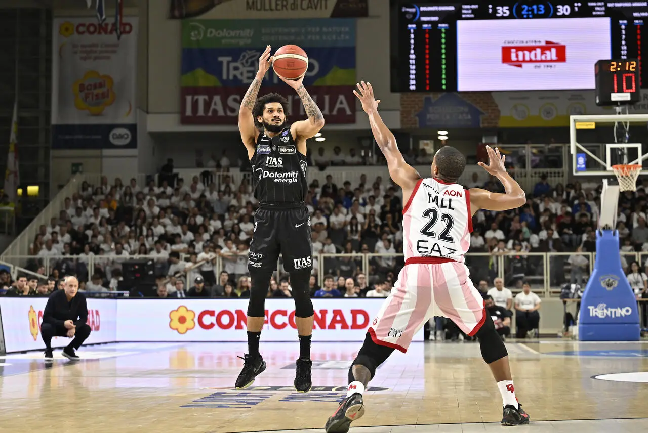 La cronaca del match. I bianconeri trasformano la febbrile attesa per gara-3 in un avvio da brividi tra una gran difesa su Mirotic e i canestri in sequenza di Mooney e Baldwin (9-2 e timeout Messina). Con una tripla di Hubb, appena entrato al posto di Mooney gravato di due falli, arriva il 12-5; poi Milano alza l’intensità della propria difesa affidandosi al “totem” Hines e opera il sorpasso intorno al finale di quarto (12-15 con uno 0-10 di break). Un gioco da tre punti di Cooke ridà un po’ di ossigeno all’attacco di Trento, i primi 10’ si chiudono però con gli ospiti avanti 15-17. Sono tre triple di Hubb a scandire i ritmi di un secondo quarto che per i padroni di casa sono all’insegna della sfrontatezza offensiva: Mooney e Forray fanno impazzire il palazzetto (29-26), Ellis e Biligha producono un paio di prodezze intorno al ferro, al resto pensa capitan Forray che segna 4 punti consecutivi (38-30). Una sfuriata di Napier però ancora una volta permette alle Scarpette Rosse di rimanere avanti alla chiusura del secondo quarto (38-40). L’Olimpia vuole scappare via ma trova sulla sua strada la capacità di saper soffrire e resistere di Forray e compagni: Napier è scatenato ma Baldwin e Hommes rispondono a tono (47-49). Una tripla di Melli dà agli ospiti il massimo vantaggio di serata, dopo 30’ di gioco siamo 53-58: l’ultimo quarto si apre con due triple pesantissime di Voigtmann (58-68), Toto non vuole mollare la presa ma l’Olimpia controlla le operazioni nel finale e chiude i conti. Il finale è 68-83. Domenica i bianconeri lotteranno per allungare la serie al quinto atto.