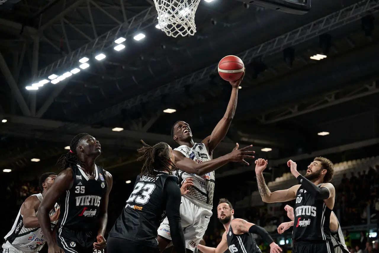 Cordinier sblocca la sfida, poi Niang in lunetta pareggia i conti. Shengelia, con la sua classica virata, segna altri due punti, ma Pecchia risponde con un tap-in. Cordinier è preciso dalla lunetta e, insieme ai liberi di Shengelia, porta le Vu Nere sul 7-4, ma poco dopo Lamb rimette tutto in equilibrio. Bologna prova ad allungare con una tripla di Cordinier e un jumper di Diouf, mentre Ellis risponde dalla media distanza. Diouf inchioda la schiacciata e Polonara aggiunge punti dalla lunetta, regalando il +7 ai padroni di casa. Ford, con un appoggio morbido, prova a riportare sotto i trentini, ma Bologna allunga ancora con Pajola e il solito Cordinier, toccando il 22-13 e costringendo coach Galbiati al timeout. Nel finale, la tripla di Forray sulla sirena fissa il punteggio del primo quarto sul 26-20.