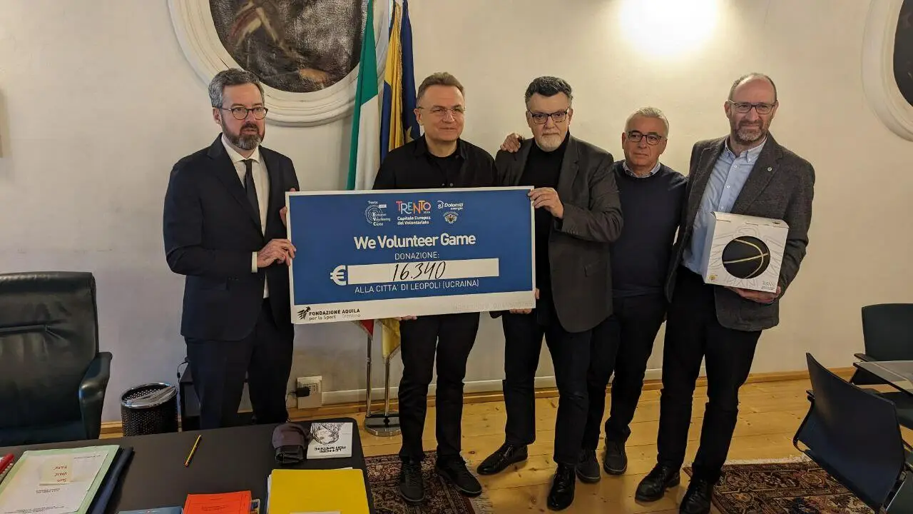 L’ingresso alla “Il T quotidiano Arena” era a offerta libera e il ricavato delle donazioni – 16.340 euro - è stato consegnato sabato pomeriggio a Palazzo Geremia da una delegazione di Aquila Basket, composta dal Presidente Luigi Longhi, dal vicepresidente Bruno Giampieretti e dal direttore della Fondazione Aquila per lo Sport Trentino Massimo Komatz, ad Andrij Sadovyj, sindaco di Leopoli, la città in prima linea nell’accoglienza dei profughi della guerra ucraina, colpita essa stessa in questi ultimi mesi da missili e droni russi. Leopoli era stata candidata a Capitale europea del volontariato per il 2024 assieme a Trento.