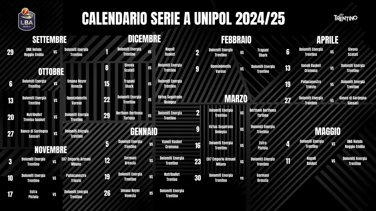TRENTO – La Serie A UnipolSai ha diramato in mattinata il calendario ufficiale che vede la Dolomiti Energia Trentino esordire al PalaBigi contro la UNA Hotels Reggio Emilia il 29 settembre. Nella seconda giornata in programma il 6 ottobre, la prima in casa, i bianconeri ospiteranno l’Umana Reyer Venezia. Anche la terza giornata sarà un turno casalingo, che vedrà Trento impegnata contro l'Openjobmetis Varese dell'ex Davide Alviti.