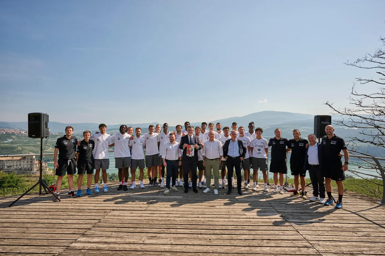 La Dolomiti Energia Trentino si è presentata al Dos Del Pez davanti alle aziende che la supportano e alla presenza delle autorità che hanno permesso la realizzazione dall’Aquila Basket Training Camp. Lorenzo Paoli (presidente dell’APT Val di Non), Ruggero Mucchi il sindaco di Cles e l’ingegnere Luca Zaglio (Direttore Generale di Melinda) hanno accolto la squadra diretta dall’Head Coach Paolo Galbiati accompagnata dal presidente Luigi Longhi che hanno rinnovato sin da subito il calore con il quale ogni anno la squadra viene accolta dalla comunità nonesa.