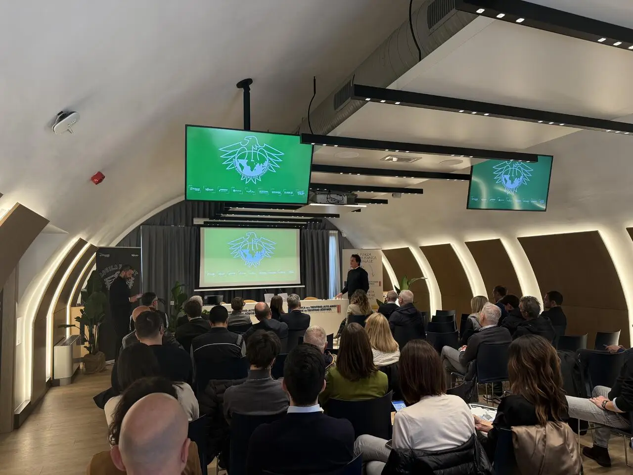 Luigi LONGHI (Presidente DOLOMITI ENERGIA TRENTINO): «Aquila Basket ha nel suo DNA un moto perpetuo: fare un passo alla volta verso un futuro che sappia unire tutti i capitoli della nostra storia, coinvolgendo ogni membro della nostra famiglia per diventare un lievito positivo nella crescita della comunità. Voglio ringraziare tutte le persone che hanno collaborato a questo progetto, perché lo considero davvero fondamentale: racchiude il senso più profondo del nostro essere qui, nel cuore del Trentino. Essere sostenibili significa offrire garanzie dal punto di vista ambientale, migliorare la qualità della vita, essere credibili nello sport e avere un impatto culturale. Se riusciremo a mettere insieme tutti questi elementi e a farli crescere in modo armonico, potremo generare un motore in grado di produrre frutti che vanno ben oltre ciò che oggi possiamo immaginare. Non solo per noi, ma per il futuro, per le generazioni che verranno e per chi continuerà a credere nel nostro modo di essere».
