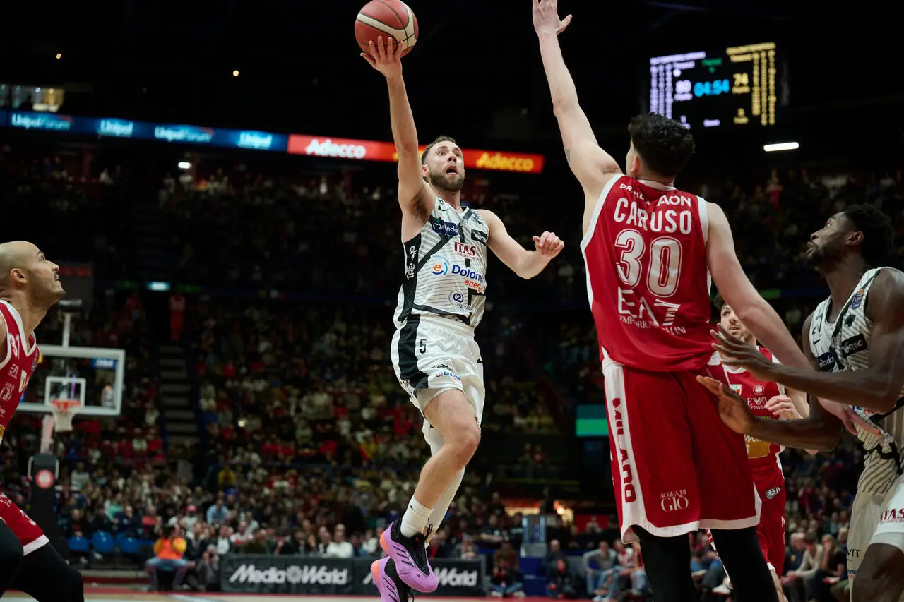Zukauskas apre l’ultimo quarto con una gran tripla, ma Brooks risponde subito con un elegante stepback dalla media distanza. Trento si riporta a un solo punto di distanza grazie ai canestri di Ellis e Ford, ma Milano replica con Dimitrijevic. Niang schiaccia con autorità, ma Leday piazza una tripla con fallo che vale il 78-71 per l’Olimpia. I bianconeri costruiscono un’ottima azione offensiva trovando Ford libero dall’angolo per il -4, ma Shields segna dalla media distanza. Zukauskas risponde immediatamente, Ellis schiaccia per il -2 e Mawugbe inchioda il pareggio su assist di Ellis, facendo esplodere la panchina trentina. Mirotic non trema dalla lunetta e poco dopo realizza una tripla pesantissima che riporta Milano sul +5 a un minuto dalla fine. Niang sfiora una schiacciata spettacolare ma subisce fallo da Mirotic e realizza entrambi i liberi. Trento cattura il rimbalzo sul possesso successivo, ma Cale sbaglia la tripla del pareggio. Mannion, glaciale dalla lunetta, fa 2/2 e sulla sirena la tripla di Zukauskas fissa il punteggio finale sull’89-87 per Milano.
