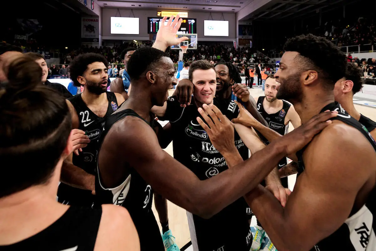 Mawugbe e Lamb aprono il quarto periodo, spingendo Trento sul +16. Bowman risponde con una tripla, seguito da Caroline, ma Ellis segna altri due punti e Forray firma la tripla che porta i bianconeri sull’88-73. Treviso tenta di riavvicinarsi, ma Cale vola e realizza una schiacciata spettacolare su Paulicap, facendo esplodere i 4.000 cuori bianconeri presenti a “Il T Quotidiano Arena”. Poco dopo, Ellis segna una tripla che vale il 95-78. Nel finale, Trento gestisce il vantaggio con autorità e chiude la partita con una vittoria per 101-86.