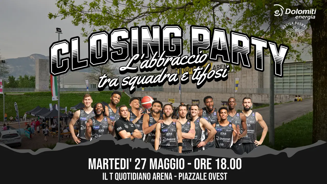 TRENTO – Al Forum di Assago si è conclusa la straordinaria stagione della Dolomiti Energia Trentino, dopo un’ennesima battaglia da applausi. Una stagione da record che merita di essere celebrata insieme: per questo vi aspettiamo numerosi alla festa di fine stagione alla “IL T Quotidiano Arena” martedì 27 maggio alle ore 18:00 per un ultimo, grande saluto a una squadra che ha scritto una pagina storica di Aquila Basket.
